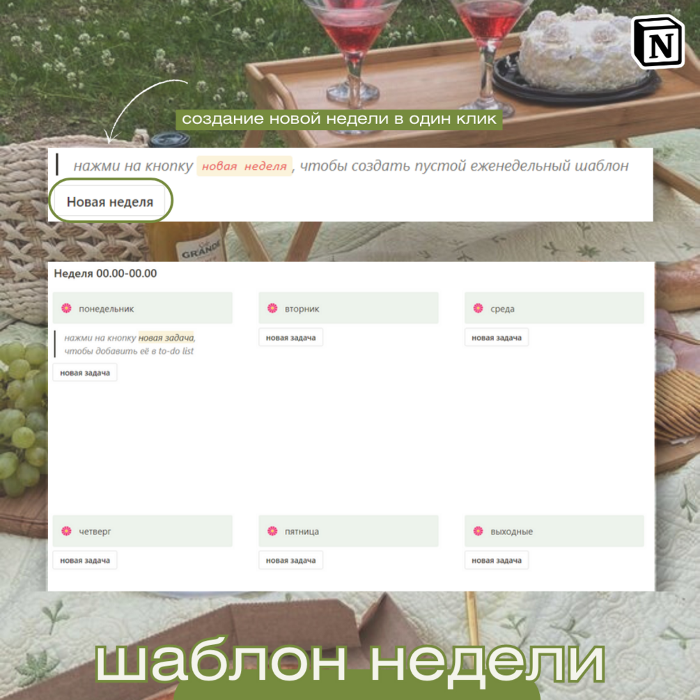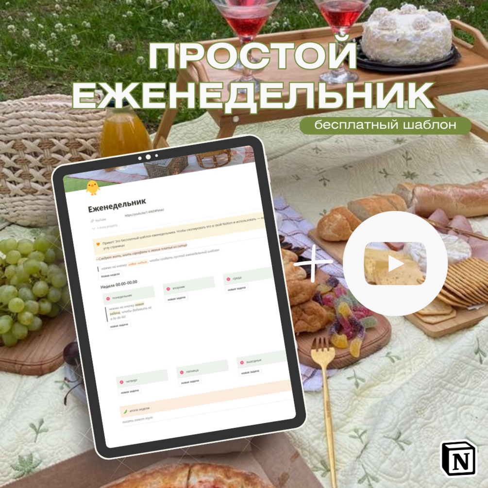 Шаблон "Простой еженедельник" в Notion - классное решение, которое сделает вашу неделю более структурированной и вдохновляющей. В него встроены две волшебные кнопки, которые превратят процесс планирования в удовольствие.