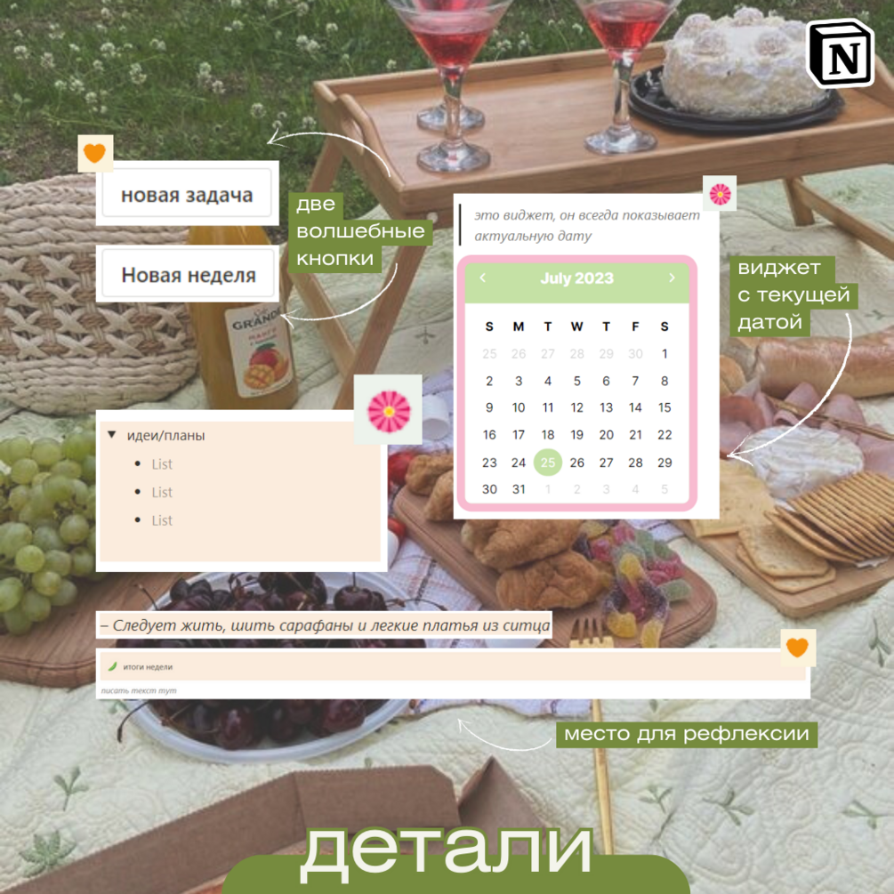 • Быстрая запись идей: Записывайте возникающие идеи, которые приходят, когда вы активно планируете свою неделю.